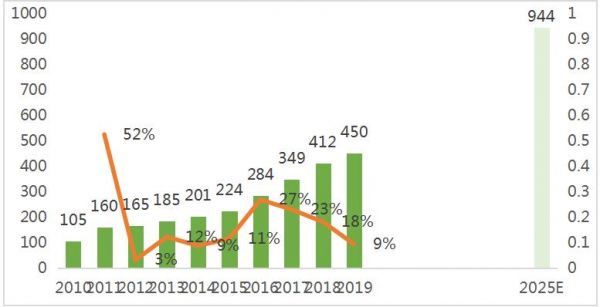 全球锂二次电池市场逐年增长,市场规模预计2025年相对于2019年翻倍。2015-2019年全球锂二次电池市场规模呈逐年增长态势,年均复合增速达19%,2019年市场规模为450亿美元。全球第二大市场研究机构Markets and Markets最新发布的报告,预计到2025年,全球锂二次电池市场需求将增至944亿美元。