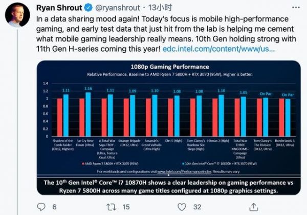 英特尔首席性能专家 Ryan Shrout 近日在推特上公布了一组数据,对比了英特尔和 AMD 游戏本的游戏性能。