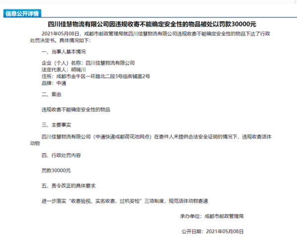 目前成都市邮政管理局对2家涉事企业正式作出行政处罚:四川佳慧物流有限公司(中通快递成都荷花池网点)在寄件人未提供合法安全证明的情况下,违规收寄活体动物,被处以罚款30000元(人民币,下同);成都中竞物流有限公司(中通快递四川省管理中心)在快件安全保障方面对四川佳慧物流有限公司(中通快递成都荷花池网点)未实行统一管理,被处以罚款50000元。
