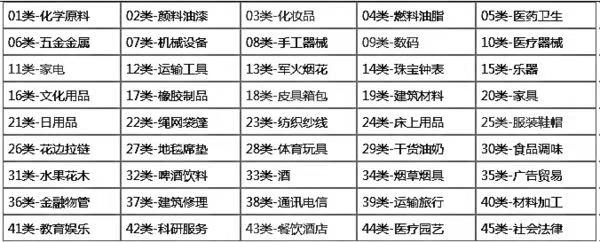 商标类别指的是所要注册的商标所属的行业,我国采用尼斯商品分类,商标注册用商品和服务分类表共分为45类,指向特定的产品与服务,其中1-34是商品类别,35-45是服务类别。商标分类后可便于检索、管理、审查。