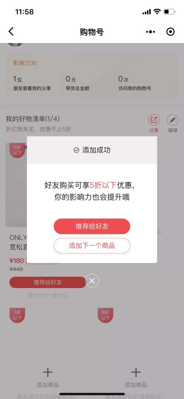 点击“添加推荐”按钮即可定制自己的购物清单,给好友推荐5折以下,6折以下、7折以下、8折以下的四件商品。