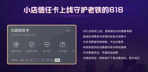 据悉,快手“小店信任卡”产品的推出将作为此次616品质购物节两大重磅内容之一,同时也是快手极致信任机制的重要承载。快手“小店信任卡“将于6月1日正式上线,全面守护广大老铁的购物体验。