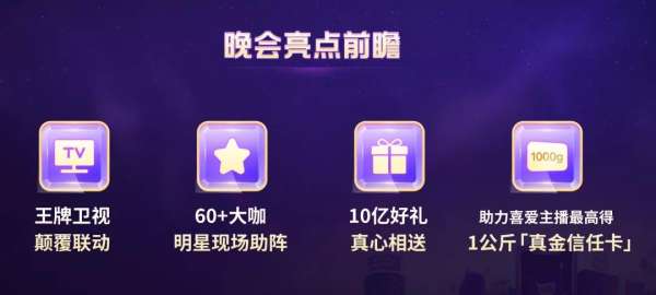 作为616活动的压轴大戏,快手电商特别为此次的晚会打造了四大亮点:一是与江苏、浙江两大王牌卫视梦幻联动,带动百亿级别曝光;二是60多位大咖明星携手快手王牌主播现场助阵,并通过“1+N”模式打造观赏、购物、互动一体化的主题乐园;三是快手将送出10亿好礼,更有百万件商品1元购、抽选送钻戒等福利;四是在助力喜爱的主播上晚会活动中,为冠军主播投票最多的粉丝将获得1公斤“真金信任卡”,以及快手小店全年12万的购物基金。