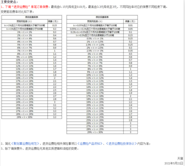 调整后,“退货运费险”单笔订单保费最低由0.15元降低至0.01元,最高由3.3元降低至3元。