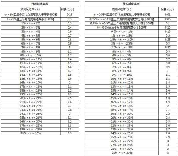 修改后费率表显示,预测风险率小于等于0.05%,且三个月内交易笔数大于等于100笔,保费为0.01元;预测风险率大于0.05%、小于等于0.1%,且三个月内交易笔数大于等于100笔,保费为0.05元;预测风险率大于0.1%、小于等于0.5%,且三个月内交易笔数大于等于100笔,保费为0.1元;预测风险率小于等于0.5%,且三个月内交易笔数小于100笔,保费为0.15元。
