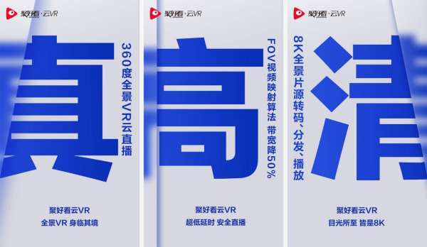 6月3日,第九届中国网络视听大会在成都召开,聚好看科技发布了行业首个双8K VR直播云平台“聚好看云VR”,精攻FOV视域映射算法和传输技术、突破低带宽占用下高码率低时延的8K超高画质直播技术挑战,率先实现平面、VR双8K超高清直播。