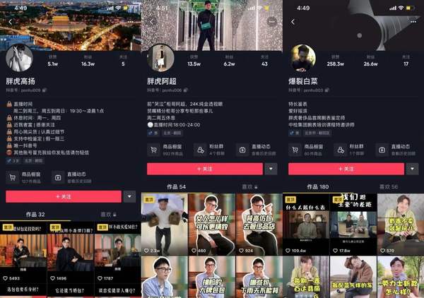 除了店播号外,胖虎还培养了多个风格鲜明的IP人设账号。