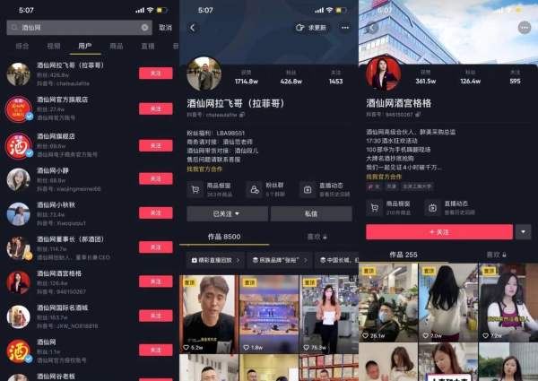 除了胖虎,酒仙网也同样采用了“品牌+多人设IP”的矩阵玩法,除了品牌号@酒仙网旗舰店、@酒店网官方旗舰店外,还设置有@酒仙网拉飞哥、@我是小张(酒仙三疯)、@酒仙网酒宫格格、@酒仙网董事长等多个带货IP,据卡思观察,过去30日里,仅@酒仙网拉飞哥(拉菲哥)一个账号带货GMV就超过了8400万。