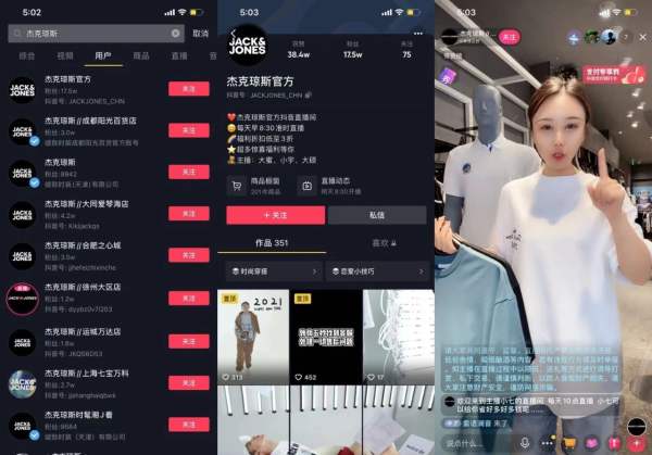 欧洲知名男装品牌杰克琼斯自2000年进入中国市场以来,在中国大陆已经拥有超过2300家店铺。凭借庞大的线下实体店规模和较强的品牌知名度,杰克琼斯官方也在抖音开启了的常态直播,同时,投身直播的还有规模庞大的线下实体店,如@杰克琼斯//合肥之心城,@杰克琼斯//成都阳光百货店,@杰克琼斯//太原万象城ULTRA等。据卡思观察,名为“杰克琼斯JACK&JONES男装旗舰店”的抖音小店,在过去30日内,共计销售额达到了215.1万。除了杰克琼斯外,(母品牌)绫致时装下的其他品牌,如:ONLY、VEROMODA等都有加入到抖音直播的队伍中来,相比于杰克琼斯以“店铺命”名,ONLY、VEROMODA则多以“城市”命名。