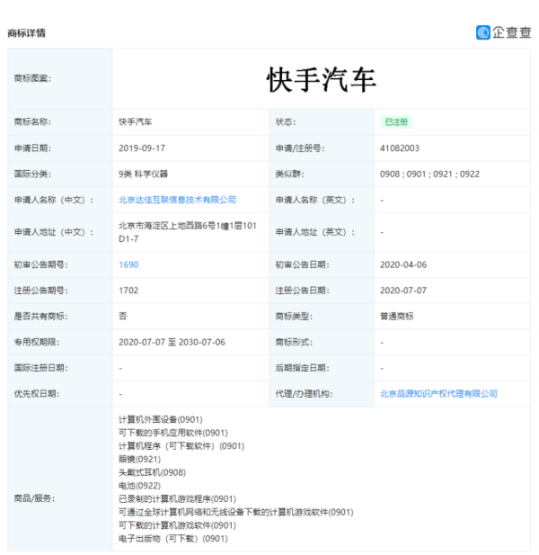A5创业网(公众号:iadmin5)6月18日报道:企查查 App 显示,快手关联公司北京达佳互联信息技术有限公司曾于 2019 年 9 月申请注册快手汽车商标。