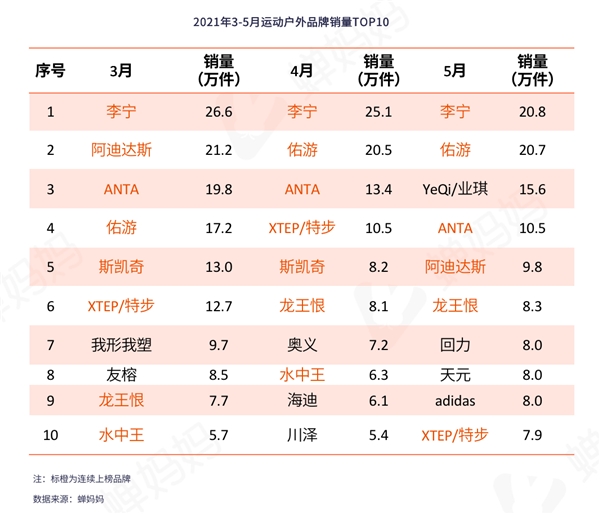 运动户外品牌TOP10中,李宁、佑游、ANTA等品牌霸榜,3月-5月期间这三个品牌的排名均位居前4,其中李宁连续3月蝉联榜单第一;