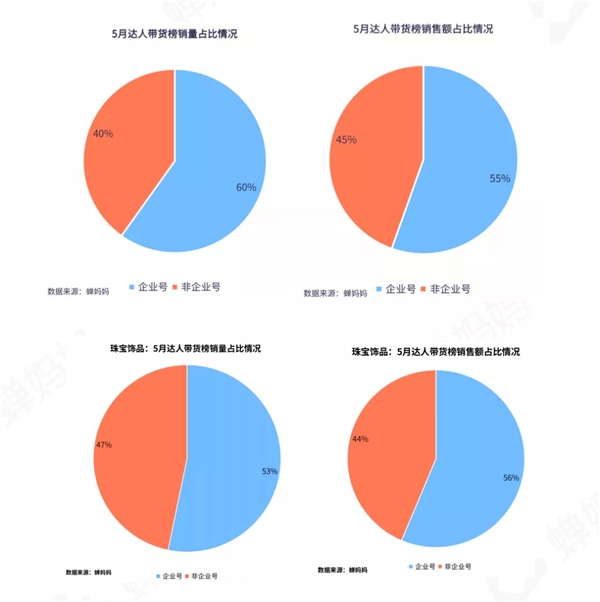 5月的达人带货榜中,企业号在销量占比与销售额占比分别为60%、55%,珠宝饰品大类的销量占比和销售额占比分别为53%、56%,珠宝饰品大类商品为企业号主推,企业号价值得到初步体现。