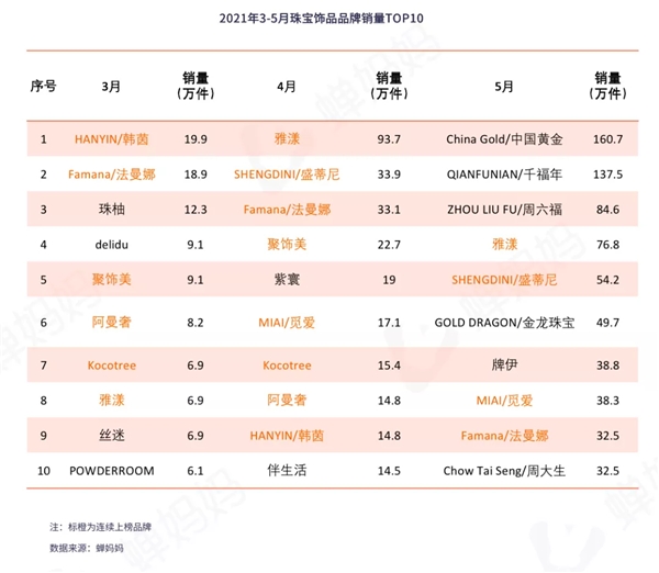下表为2021年3月-5月抖音平台珠宝饰品行业品牌销量TOP10情况,主要可以看出以下规律: