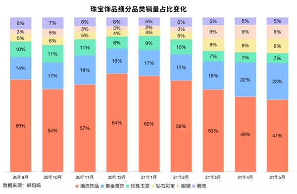 根据蝉妈妈数据分类,珠宝饰品大类共分为潮流饰品、黄金首饰、珍珠玉翠、钻石彩宝、眼镜、腕表六个一级分类,每个一级还有相对应的二级分类。