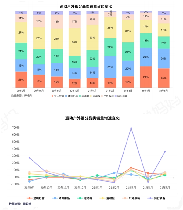 每年5月为运动户外的季节性旺季,2021年5月运动户外大类销量大幅上涨,环比增速达54.5%。从细分品类来看,登山野营与体育用品并驱争先,二者从2020年12月开始销量占比呈震荡增加态势,至2021年5月二者之间的销量占比非常接近,分别为25%、26%。