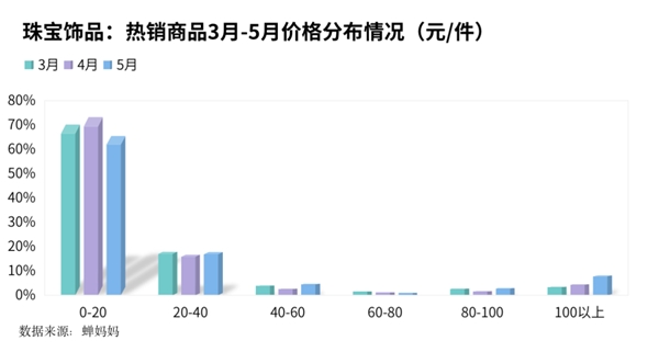 从珠宝饰品大类热销商品价格分布情况可以看出,超八成的商品价格在0-40元,其中0-20元的商品价格占比最大,为65%。不过,值得注意的是珠宝饰品产品正在逐渐向高端化、品质化转变,价格在100元以上的商品明显增多,占比从3月的3%增加至5月的8%。