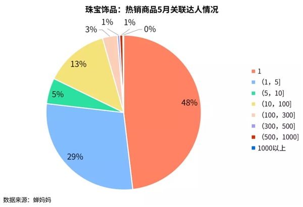 关联达人方面,有48%的商品仅有1位关联达人,有29%的商品有1-5位关联达人,珠宝饰品热销商品多为个位数达人主推而成。