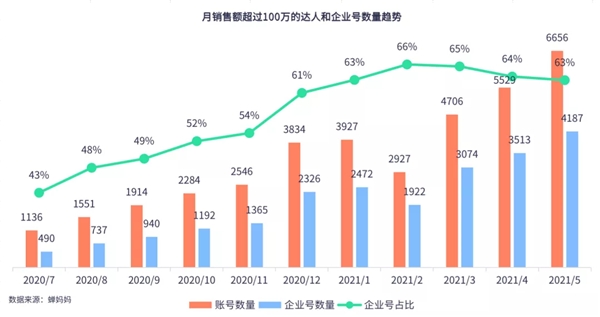 但是,从达人带货月榜中企业号用户数占比来看,月销售额超过100万的账号中,抖音企业号用户数占比自2021年2月触达66%的高点后持续微幅下调,5月抖音企业号用户数占比为63%;月销售额超过1000万的账号中,抖音企业号用户数占比自2021年2月触顶后亦高位调整,上方压力大。整体来看,无论是头部主播达人,还是腰部达人(月销售额超过100万),企业号占比均进入高位调整,上方压力大,“品牌自播”vs“达人带货”或已达平衡状态 。
