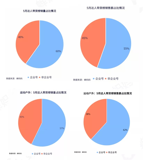 5月的达人带货榜中,企业号在销量占比与销售额占比分别为60%、55%,运动户外大类的销量占比和销售额占比分别为57%、62%,运动户外大类商品为企业号主推,企业号价值得到初步体现。