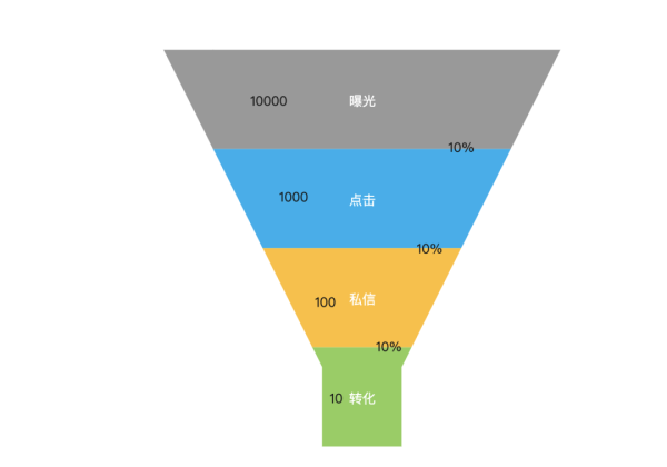 那我们就可以根据这个关键点做个流量漏斗了,曝光是这4个里最多的,我们放到最上面,点击是其次的,我们放中间,转化最重要,我们放底部。