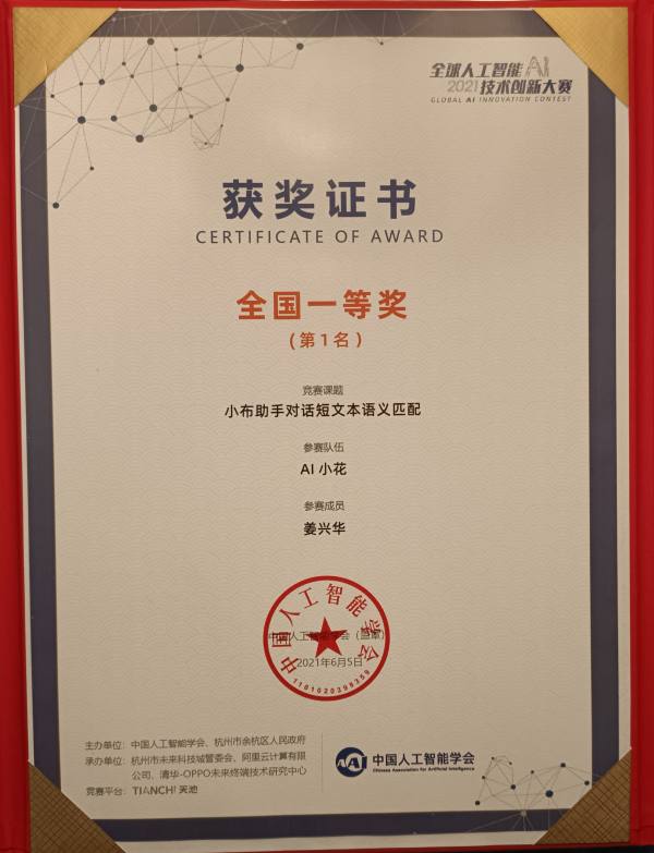 浙江大学计算机专业硕士姜兴华作为“AI小花”的队长、唯一成员,在来自528所中国高校和136所海外高校、超过15000名选手的巅峰对决中,最终排名第一,拿下了“首届全球人工智能技术创新大赛”的最高奖项和奖金。赛后,姜兴华收到了众多大厂的盛情邀约。
