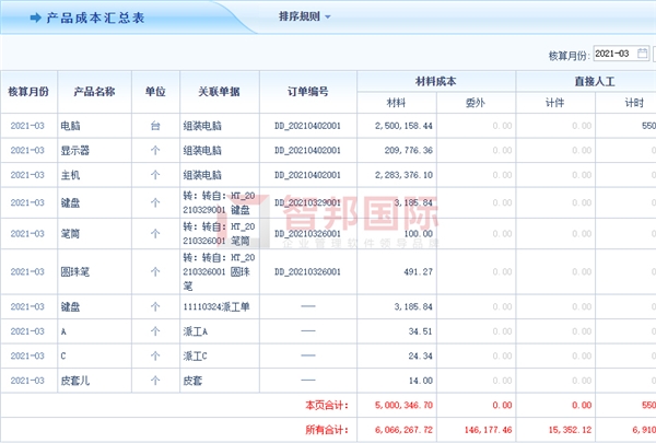 智邦国际工厂ERP管理软件,产品成本汇总表全面展示每笔成本明细及来源