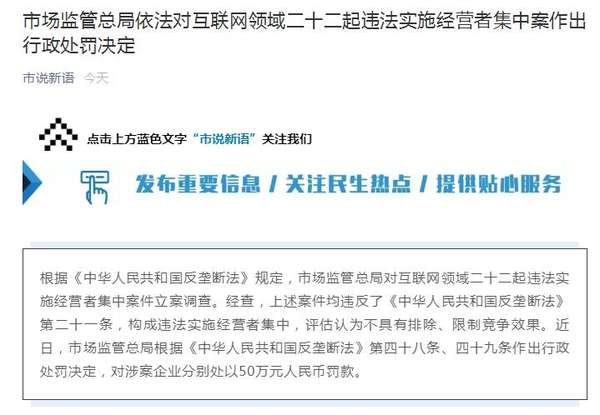 A5创业网(公众号:iadmin5)7月8日报道:今日,市场监管总局依法对互联网领域二十二起违法实施经营者集中案作出行政处罚决定。