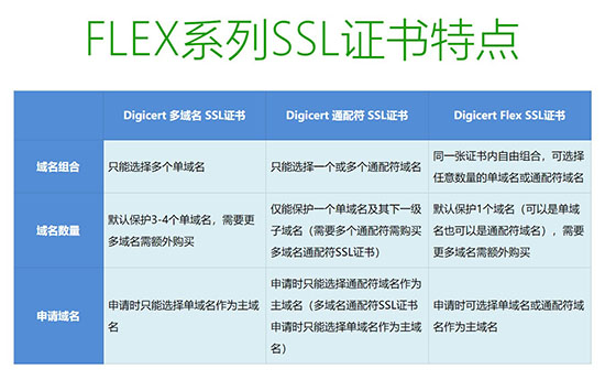什么是Flex SSL证书?相比于传统的SSL数字证书,Flex系列证书最大的特点就是具有灵活性和可扩展性。以前在申请传统的SSL证书时,我们根据域名的数量来申请多域名或者通配符证书,而现在只需申请一张Flex系列SSL证书就可以搞定,因为它支持随时自由搭配、混合添加多达250个单域名或通配符SAN(默认保护1个单域名或通配符域名),用最经济的组合方式准确地满足您的需求,让客户在使用和管理数字证书时更灵活、更方便。