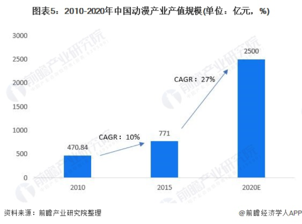 据“前瞻产业研究院”数据显示,中国动漫产业市场规模在2020年预计达到2500亿,自2015年以来高速增长;