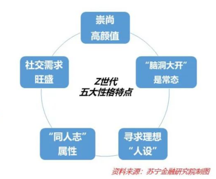 而在性格方面,苏宁金融研究院的一份报告认为在“二次元”影响下,Z世代的五大性格特点是社交需求旺盛、崇尚高颜值、“脑洞大开”是常态、“同人志”属性、寻求理想“人设”。