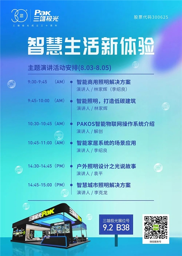 展会期间,三雄极光展厅内还设置多个干货满满的主题演讲,内容涵盖智能商用照明解决方案、智慧城市照明解决等多个主题演讲。另外,8月5日上午,光亚展现场A区3.1馆 B55还将同步举办2021照明企业数字化营销新思路论坛,并邀请到多名实战派营销专家及数字营销平台服务商深度探讨如何抓住短视频、直播时代的风口。总之,超多实用知识干货分享,这届光亚展绝不容错过。