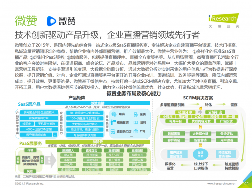 值得关注的是,作为一站式企业级SaaS直播服务商,微赞连续在2019年、2020年、2021年均入选成为艾瑞咨询公布的中国企业直播服务市场竞争梯队第一梯队,产品力、服务力、创新力等头部服务商优势显著。