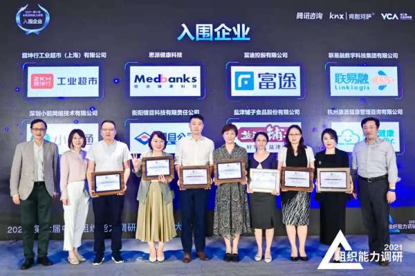 经过独立评审委员会的匿名遴选,共有8家企业在本届组织能力调研中脱颖而出,其中震坤行、思派健康科技、富途控股、盐津铺子荣获“2021中国组织能力调研最佳实践奖”,联易融、小鹅通、镭目公司、智云健康获得“2021中国组织能力调研最佳实践入围企业奖”。