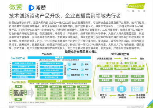 同时,依托微信生态,微赞直播打造了包括多样化的标准SaaS直播产品+定制化PaaS服务+增值属性的SCRM解决方案等立体化的产品业务,提供从引流获客、交易变现到数据分析综合一体方案。