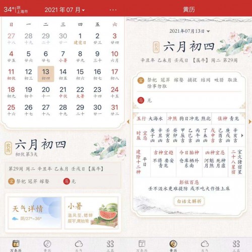 针对此,墨迹万年历将现代万年历与传统黄历功能相结合,不但在应用中融入公历、农历和干支历等多套历法,更是将黄历的吉凶宜忌、二十四节气、传统节假日等内容涵盖在内,弥补了手机自带日历应用功能的单一性,满足不同人群在选日择时方面的不同需求。