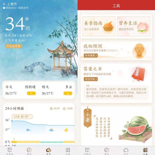 值得一提的是,有别于传统工具类APP“冷冰冰”的使用体验,墨迹万年历还在“工具”板块植入了美食指南、营养生活等生活资讯工具,以及答案之书、痣相预测等趣味娱乐性的工具,让用户在查询日历的同时,还可以了解自己感兴趣的生活资讯,享受难得的休闲时光。