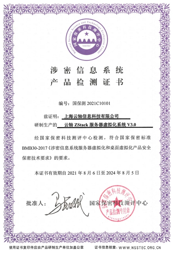 近日,ZStack自主研发的“服务器虚拟化系统”喜获由国家保密科技测评中心颁发的《涉密信息系统产品检测证书》,是极少数通过该测评的云厂商之一。作为由国家保密局认定的测评机构,国家保密科技测评中心是业内极具权威性的检测机构。这意味着ZStack已经取得了国家涉密信息系统的关键资质。同时充分体现了ZStack的涉密安全性、可靠性、稳定性以及产品性能、公司技术研发水平等方面得到国家权威机构的认可与肯定,为进一步推动我国信创云落地奠定了坚实的基础。