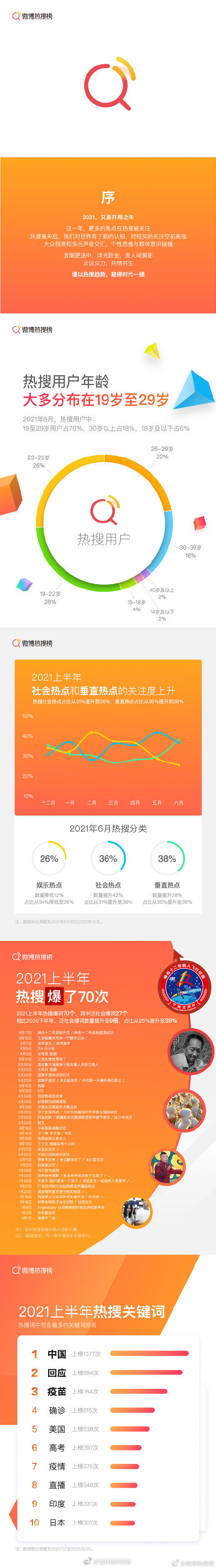 在引发全网关注的爆词方面,2021上半年热搜泛社会爆词达到27个,数量提升至9倍,占⽐从25%提升⾄39%,显著高于以往。从年龄分布上看,19-29岁是热搜的主要用户群体。