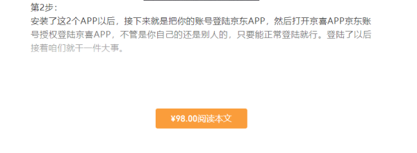 以下是我花了98元买过来的号称京东撸货最新玩法教程,对方设置了付费阅读,价格98元: