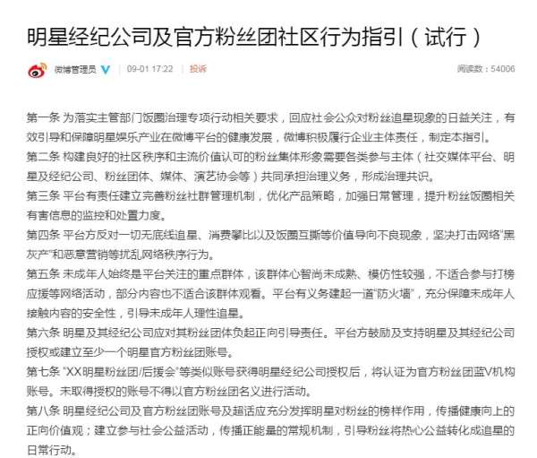 A5创业网(公众号:iadmin5)9月2日报道:微博为落实中央网信办《关于进一步加强“饭圈”乱象治理的通知》相关要求,发布了明星经纪公司及官方粉丝团社区行为指引(试行)》,自2021年9月1日起施行。