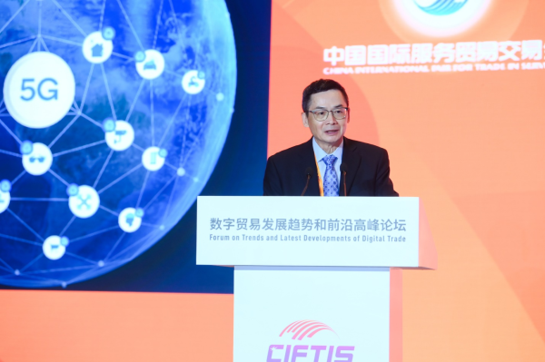 图为高通公司全球高级副总裁、技术许可业务中国区总经理钱堃出席“数字贸易发展趋势和前沿高峰论坛”并发表讲话