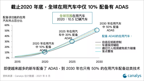 根据 Canalys预测,规模经济将降低ADAS传感器价格,到2025年约有30%的在用汽车能配备ADAS功能,2030年将增加到约为50%,这也是玩家以及新入局者伸出触角的关键所在。
