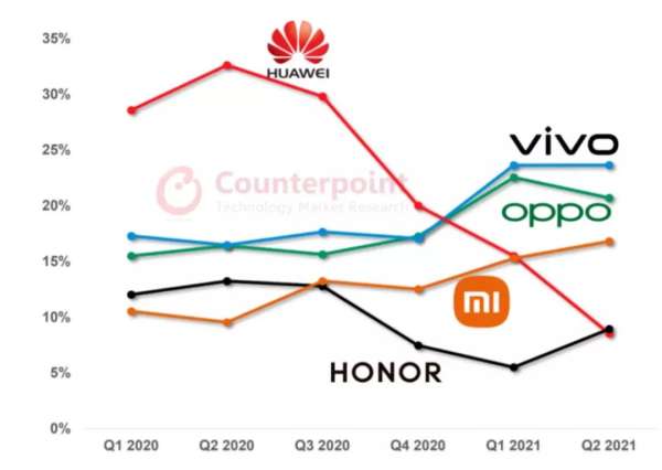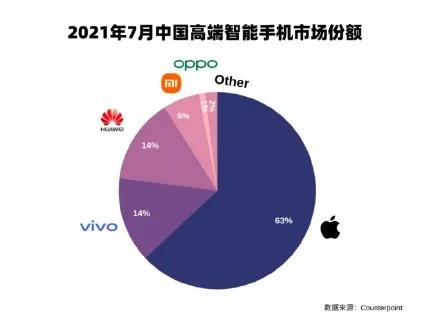 最近Counterpoint公布两个手机市场的数据还是会引发了不少行业内的讨论,一个是市场份额的数据,vivo以24%的市场份额位居中国智能手机市场第一位,这也是vivo连续第五个季度高居中国市场首位了,从市场份额来说,算是华为的接班人。而另一个数据则是七月份的高端手机市场份额,vivo和华为并列14%,遥遥领先其他国内品牌,可以说在高端手机的突破上,目前也已经达到了和华为平起平坐的层面。尽管华为还是受到芯片和出货的困扰,但从数据而言,vivo的进步相当明显,而且可以说已经取得了相当的成果。