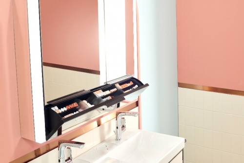 科勒博纳2.0系列镜柜搭载4000K中性色温光源,匀光照明,还原自然光线,营造自然和谐的美妆氛围。镜柜下方的便捷式翻抽空间以透明隔层合理分隔成若干个分区,大小形状不一的彩妆用品均可整齐排列,更可作为“口红吧”收纳约100支口红,免开镜门,一目了然随取随用。