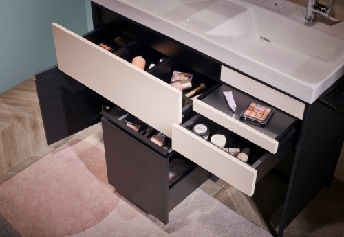 科勒博纳2.0系列浴室柜针对于不同规格品类的收纳物,细心划分多种灵活分区和储物配件,除了为美妆及护肤品、美发工具配件设置的专属收纳空间外更有方便放置小物件的弹拉小抽板,充分利用储物空间的每一方寸。一体式台盆后置落水的设计使台面易清理,同时增加柜内收纳空间。