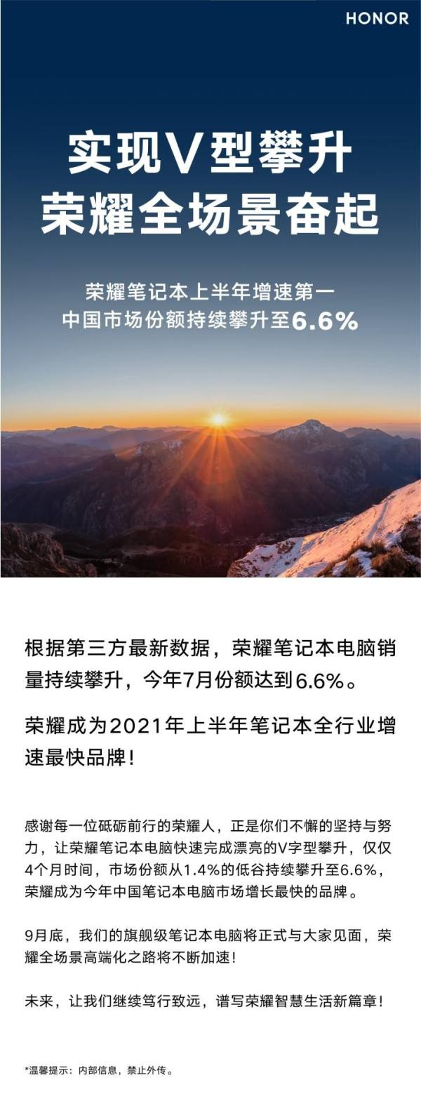 据荣耀内部信透露,根据第三方最新数据,荣耀笔记本销量持续V字型攀升,7月份中国市场份额增长至6.6%,成为2021年上半年全行业增速最快品牌。不仅笔记本领域佳绩不断,平板电脑领域也是捷报频传。IDC数据显示,2021年第一季度,独立的荣耀平板出货约53万台,同比增长68.5%,在中国的市场份额占比8.5%,位居中国前三,仅次于苹果和华为。快速崛起的荣耀智慧全场景生态,充分体现了荣耀智慧生活的强大爆发力。