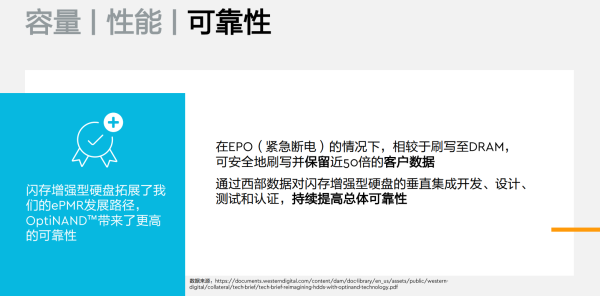 更高的数据可靠性:在紧急断电(EPO)情况下,可保留的用户数据增加了近50倍。借助西部数据闪存增强型硬盘的垂直集成供应、设计、开发、测试和认证方面的独特能力,客户可以信赖此款硬盘的可靠性。