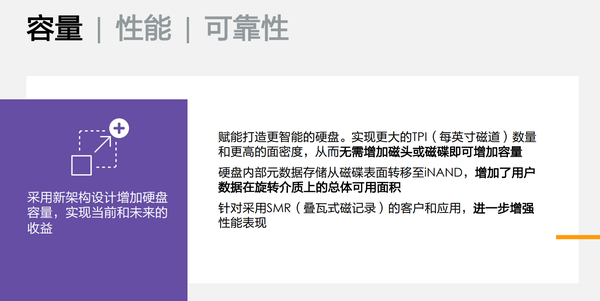 容量方面,增强的固件算法可利用已转移到iNAND的扩展元数据增加每英寸磁道数(TPI),从而增加面密度,并可以利用叠瓦式磁记录为用户提供更大的储存容量。车晓东博士表示,OptiNAND的方法是使用iNAND对硬盘操作系统进行提升,所以OptiNAND相当于将DRAM的容量增加了几百倍。