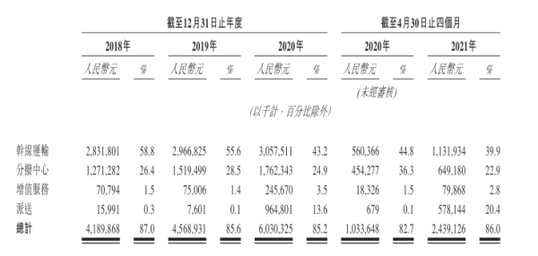 经过前几年的试探,安能结构趋于稳定,主要分为运输、增值服务和派送三大板块;其中以运输业务为主,从2018年至2020年,运输板块营收分别占总营收的84.9%、78.3%和62.9%。