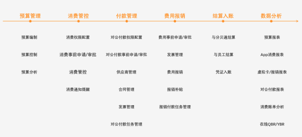 通过SaaS+交易, 从云到端 的数字化平台,分贝通四大功能模块APP付、虚拟卡、网银付、报销,覆盖企业日常费用类支出个人报销、个人借款、对公付款三大场景。